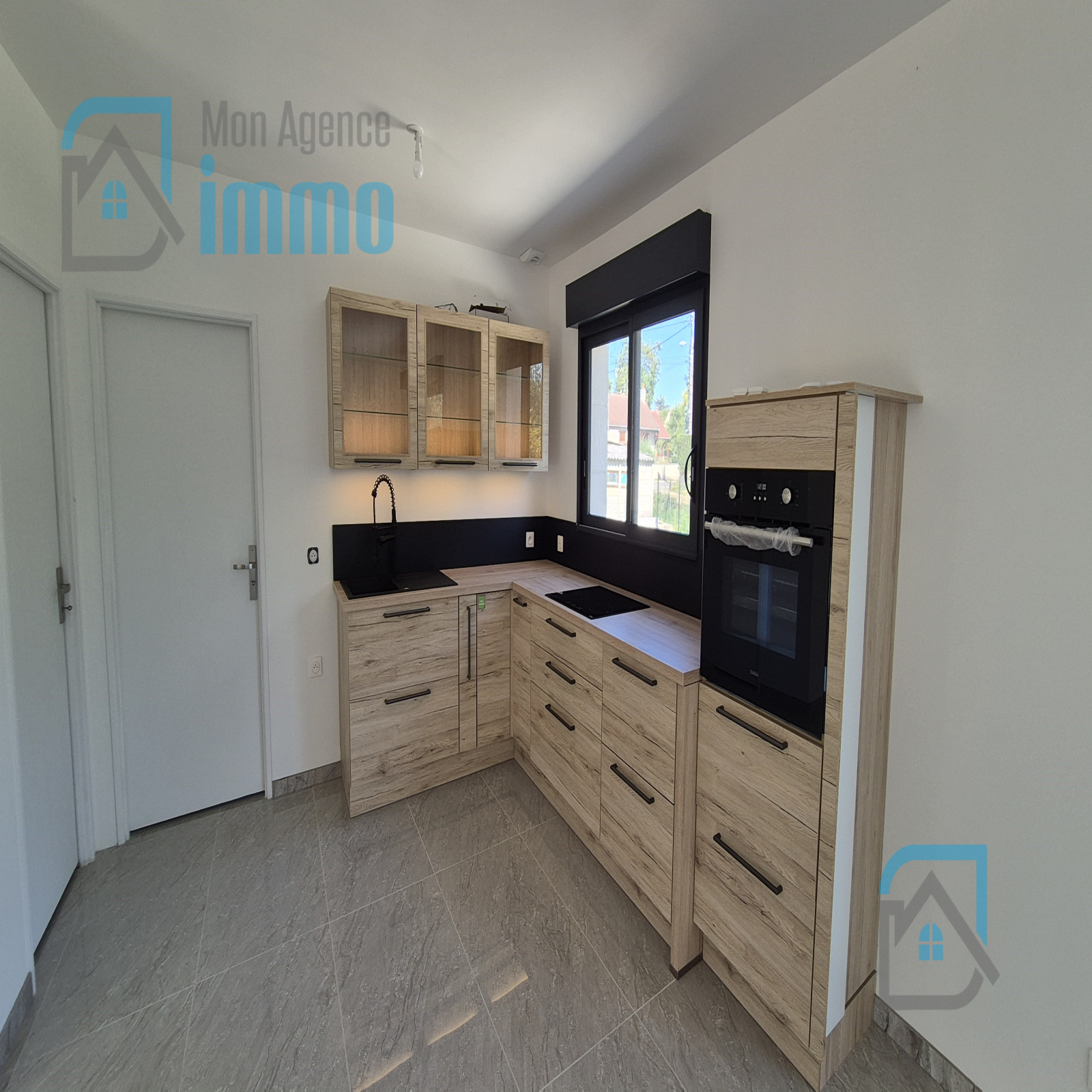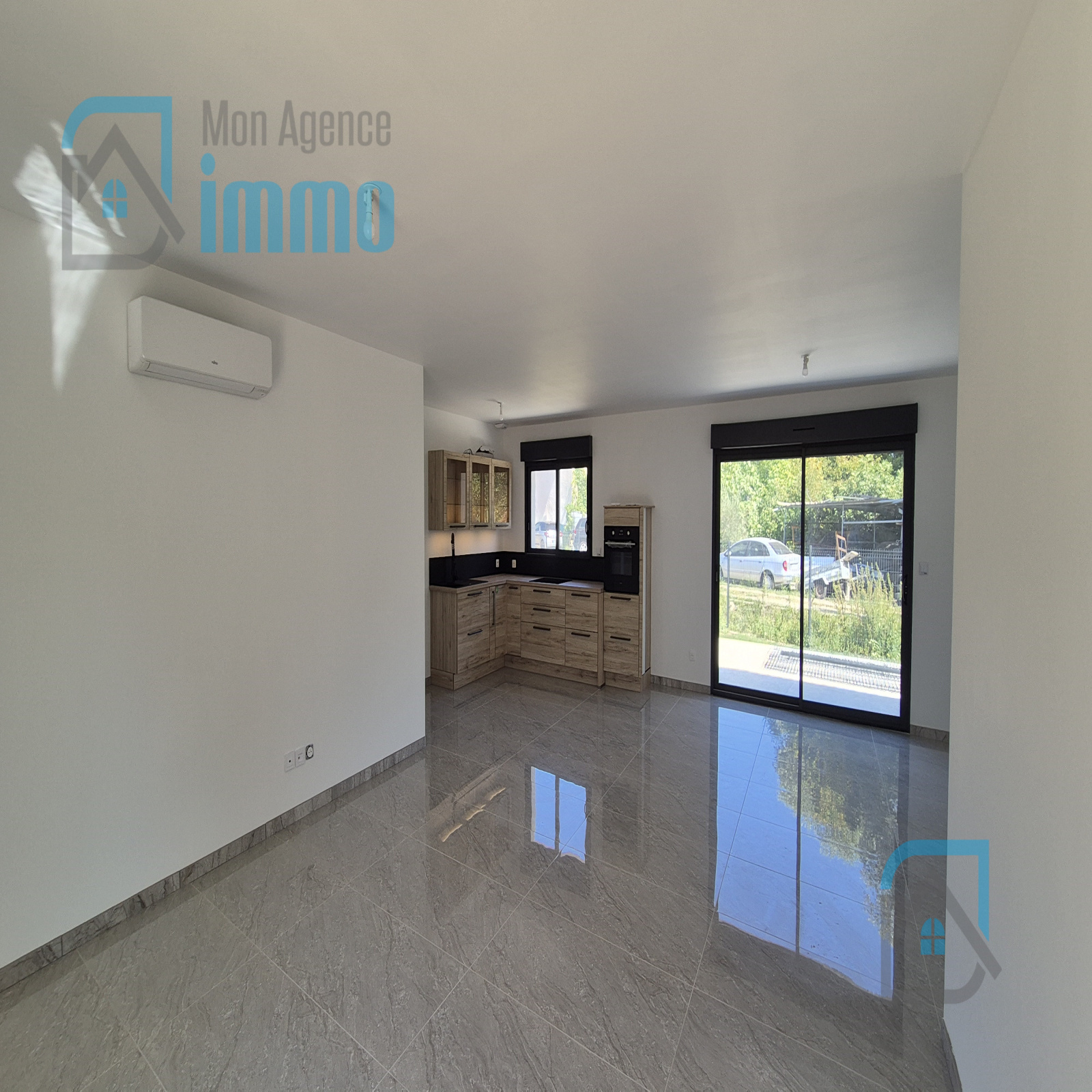 La maison s’ouvre sur une belle pièce de vie lumineuse avec cuisine aménagée ouverte sur le séjour, bénéficiant d’une lumière traversante grâce à son exposition Nord-Sud et équipée de la climatisation.